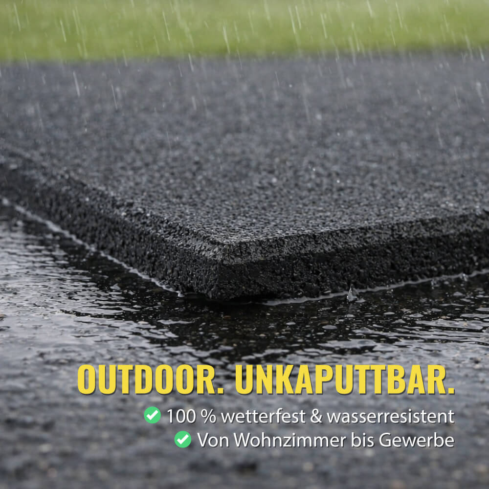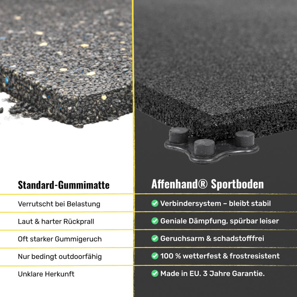Der Affenhand Sportboden hält wirklich jeglichem Workout stand. Und er ist nicht nur extrem widerstandsfähig, sondern absorbiert durch seine 20, 30 oder 43 mm Stärke auch locker sämtliche einwirkende Energie! Das heißt: weniger Vibration und weniger Lärm. Also lass den Affen raus und schmeiß die Gewichte wie es dir gefällt! Die 43mm Matten haben übrigens auf der Unterseite Noppen, um noch besser Vibration und Lärm einzudämmen. Außerdem ist der Boden nicht rutschig und hat die perfekte Härte, sodass du bei jeder Übung einen sicheren und festen Stand hast. Der Boden ist zudem 110% wetterfest – du kannst ihn also auch für dein Outdoor-Gym benutzen 😃!