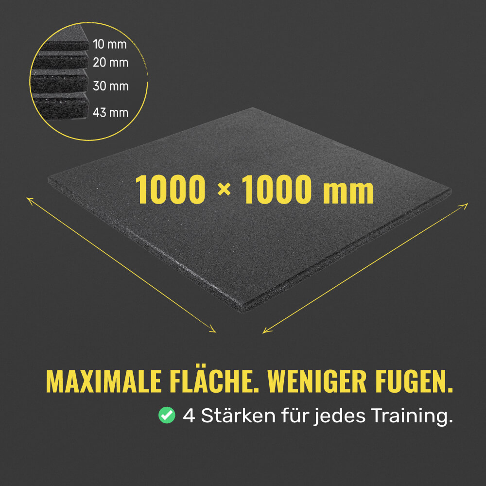 Der Boden ist DER Boden für Gyms, Fitnesscenters, den Athletikbereich bei Vereinen, den Kraftraum der Uni, die Box oder für dein Homegym. Er ist super easy zu verlegen, auch leicht zu reinigen und unangenehme Gerüche sind kein Thema, da er feuchtigkeitsresistent ist. Außerdem kannst du ihn durch seine Wärmeleitfähigkeit auch ohne Probleme auf einer Fußbodenheizung verlegen.